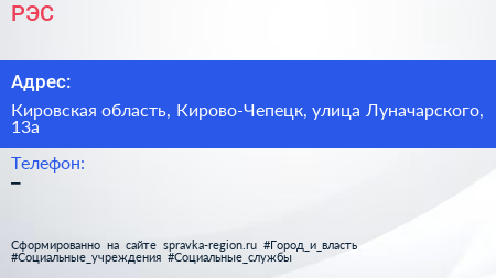 РЭС по адресу Кировская область, Кирово-Чепецк, улица Луначарского, 13а в дальнейшем Организация, размещена в следующих категориях: