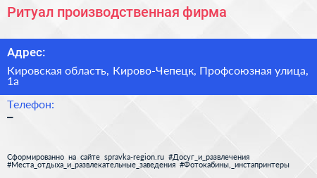 Ритуал, производственная фирма по адресу Кировская область, Кирово-Чепецк, Профсоюзная улица, 1а в дальнейшем Организация, размещена в следующих категориях: