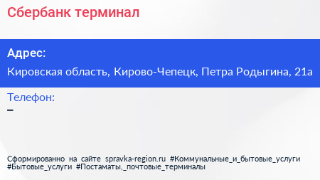 Сбербанк, терминал по адресу Кировская область, Кирово-Чепецк, Петра Родыгина, 21а в дальнейшем Организация, размещена в следующих категориях: