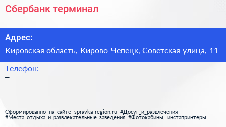 Сбербанк, терминал по адресу Кировская область, Кирово-Чепецк, Советская улица, 11 в дальнейшем Организация, размещена в следующих категориях: