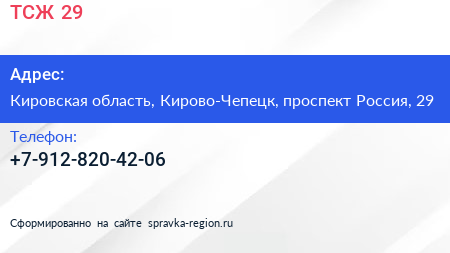 ТСЖ 29 по адресу Кировская область, Кирово-Чепецк, проспект Россия, 29 в дальнейшем Организация, размещена в следующих категориях:
