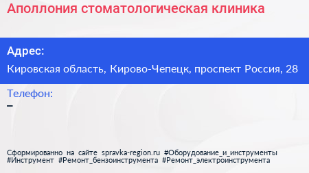 Аполлония, стоматологическая клиника по адресу Кировская область, Кирово-Чепецк, проспект Россия, 28 в дальнейшем Организация, размещена в следующих категориях: