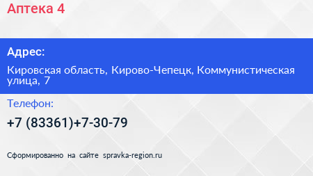 Аптека №4 по адресу Кировская область, Кирово-Чепецк, Коммунистическая улица, 7 в дальнейшем Организация, размещена в следующих категориях: