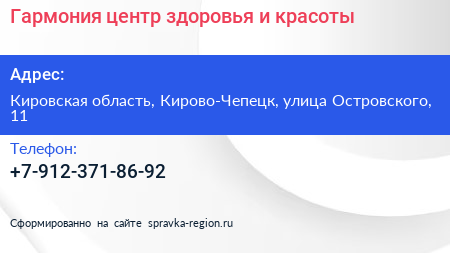 Гармония, центр здоровья и красоты по адресу Кировская область, Кирово-Чепецк, улица Островского, 11 в дальнейшем Организация, размещена в следующих категориях: