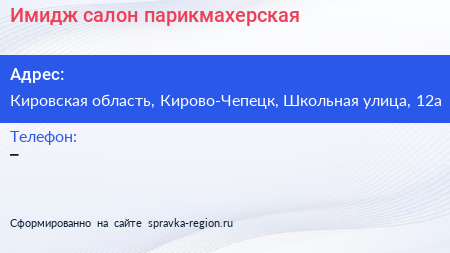 Имидж, салон-парикмахерская по адресу Кировская область, Кирово-Чепецк, Школьная улица, 12а в дальнейшем Организация, размещена в следующих категориях: