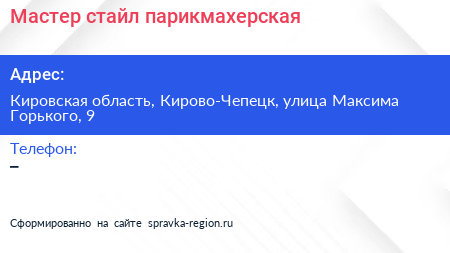 Мастер стайл, парикмахерская по адресу Кировская область, Кирово-Чепецк, улица Максима Горького, 9 в дальнейшем Организация, размещена в следующих категориях:
