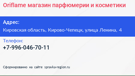 Oriflame, магазин парфюмерии и косметики по адресу Кировская область, Кирово-Чепецк, улица Ленина, 4 в дальнейшем Организация, размещена в следующих категориях: