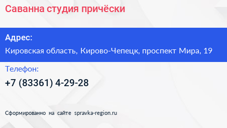 Саванна, студия причёски по адресу Кировская область, Кирово-Чепецк, проспект Мира, 19 в дальнейшем Организация, размещена в следующих категориях: