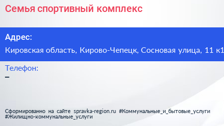 Семья, спортивный комплекс по адресу Кировская область, Кирово-Чепецк, Сосновая улица, 11 к1 в дальнейшем Организация, размещена в следующих категориях: