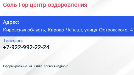 Соль Гор, центр оздоровления по адресу Кировская область, Кирово-Чепецк, улица Островского, 4 в дальнейшем Организация, размещена в следующих категориях: