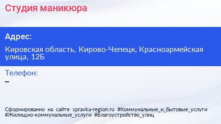 Студия маникюра по адресу Кировская область, Кирово-Чепецк, Красноармейская улица, 12Б в дальнейшем Организация, размещена в следующих категориях: