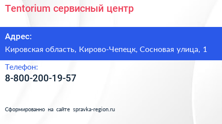 Tentorium, сервисный центр по адресу Кировская область, Кирово-Чепецк, Сосновая улица, 1 в дальнейшем Организация, размещена в следующих категориях: