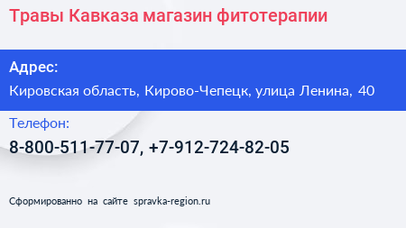 Травы Кавказа, магазин фитотерапии по адресу Кировская область, Кирово-Чепецк, улица Ленина, 40 в дальнейшем Организация, размещена в следующих категориях: