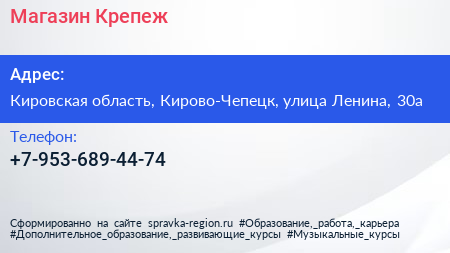 Магазин Крепеж по адресу Кировская область, Кирово-Чепецк, улица Ленина, 30а в дальнейшем Организация, размещена в следующих категориях: