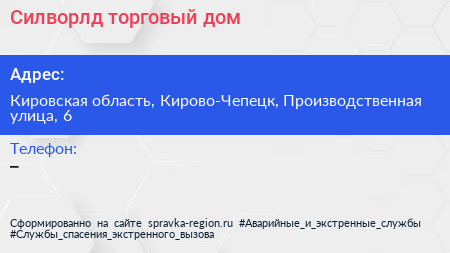 Силворлд, торговый дом по адресу Кировская область, Кирово-Чепецк, Производственная улица, 6 в дальнейшем Организация, размещена в следующих категориях: