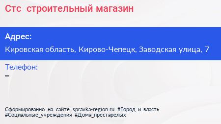 Стс+, строительный магазин по адресу Кировская область, Кирово-Чепецк, Заводская улица, 7 в дальнейшем Организация, размещена в следующих категориях: