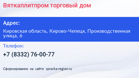 Вяткаплитпром, торговый дом по адресу Кировская область, Кирово-Чепецк, Производственная улица, 6 в дальнейшем Организация, размещена в следующих категориях: