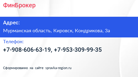ФинБрокер по адресу Мурманская область, Кировск, Кондрикова, 3а в дальнейшем Организация, размещена в следующих категориях: