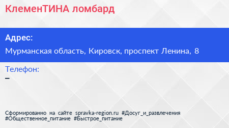 КлеменТИНА-ломбард по адресу Мурманская область, Кировск, проспект Ленина, 8 в дальнейшем Организация, размещена в следующих категориях: