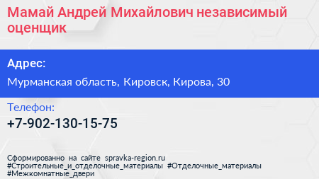 Мамай Андрей Михайлович, независимый оценщик по адресу Мурманская область, Кировск, Кирова, 30 в дальнейшем Организация, размещена в следующих категориях:
