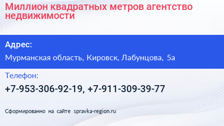 Миллион квадратных метров, агентство недвижимости по адресу Мурманская область, Кировск, Лабунцова, 5а в дальнейшем Организация, размещена в следующих категориях:
