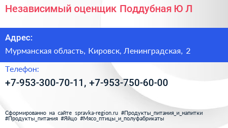 Независимый оценщик Поддубная Ю.Л. по адресу Мурманская область, Кировск, Ленинградская, 2 в дальнейшем Организация, размещена в следующих категориях: