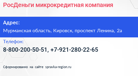 РосДеньги, микрокредитная компания по адресу Мурманская область, Кировск, проспект Ленина, 2а в дальнейшем Организация, размещена в следующих категориях:
