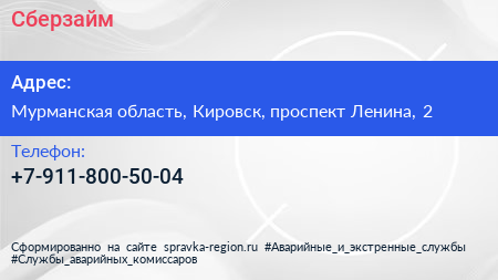 Сберзайм по адресу Мурманская область, Кировск, проспект Ленина, 2 в дальнейшем Организация, размещена в следующих категориях: