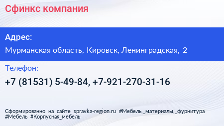 Сфинкс, компания по адресу Мурманская область, Кировск, Ленинградская, 2 в дальнейшем Организация, размещена в следующих категориях: