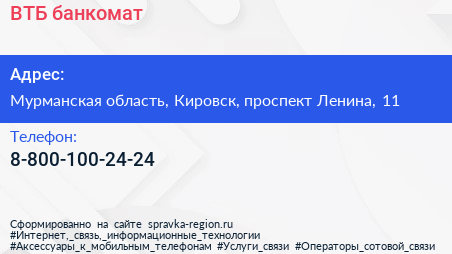 ВТБ, банкомат по адресу Мурманская область, Кировск, проспект Ленина, 11 в дальнейшем Организация, размещена в следующих категориях: