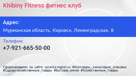 Khibiny Fitness, фитнес-клуб по адресу Мурманская область, Кировск, Ленинградская, 8 в дальнейшем Организация, размещена в следующих категориях: