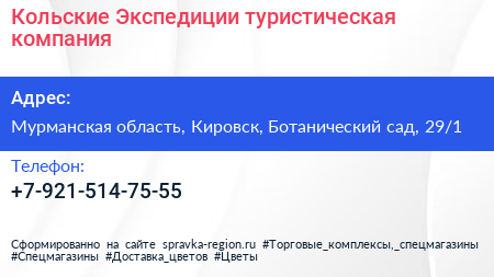 Кольские Экспедиции, туристическая компания по адресу Мурманская область, Кировск, Ботанический сад, 29/1 в дальнейшем Организация, размещена в следующих категориях: