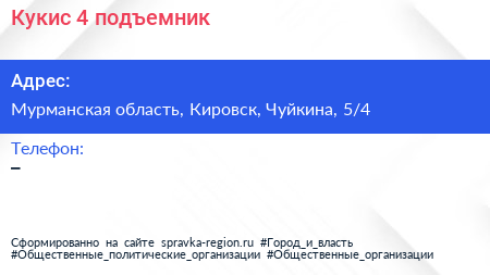 Кукис-4, подъемник по адресу Мурманская область, Кировск, Чуйкина, 5/4 в дальнейшем Организация, размещена в следующих категориях: