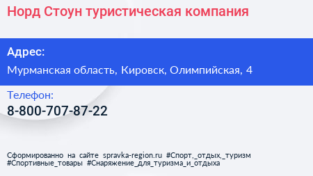 Норд Стоун, туристическая компания по адресу Мурманская область, Кировск, Олимпийская, 4 в дальнейшем Организация, размещена в следующих категориях: