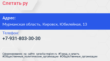 Слетать.ру по адресу Мурманская область, Кировск, Юбилейная, 13 в дальнейшем Организация, размещена в следующих категориях: