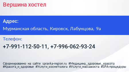 Вершина, хостел по адресу Мурманская область, Кировск, Лабунцова, 9а в дальнейшем Организация, размещена в следующих категориях: