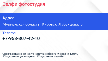 Селфи, фотостудия по адресу Мурманская область, Кировск, Лабунцова, 5 в дальнейшем Организация, размещена в следующих категориях: