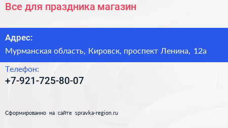 Все для праздника, магазин по адресу Мурманская область, Кировск, проспект Ленина, 12а в дальнейшем Организация, размещена в следующих категориях: