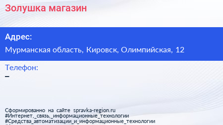 Золушка, магазин по адресу Мурманская область, Кировск, Олимпийская, 12 в дальнейшем Организация, размещена в следующих категориях: