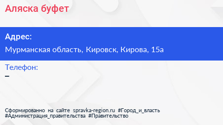 Аляска, буфет по адресу Мурманская область, Кировск, Кирова, 15а в дальнейшем Организация, размещена в следующих категориях: