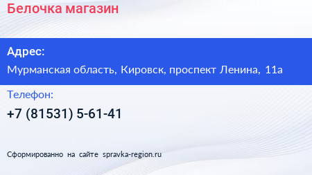 Белочка, магазин по адресу Мурманская область, Кировск, проспект Ленина, 11а в дальнейшем Организация, размещена в следующих категориях: