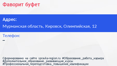 Фаворит, буфет по адресу Мурманская область, Кировск, Олимпийская, 12 в дальнейшем Организация, размещена в следующих категориях: