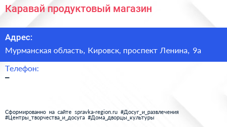 Каравай, продуктовый магазин по адресу Мурманская область, Кировск, проспект Ленина, 9а в дальнейшем Организация, размещена в следующих категориях: