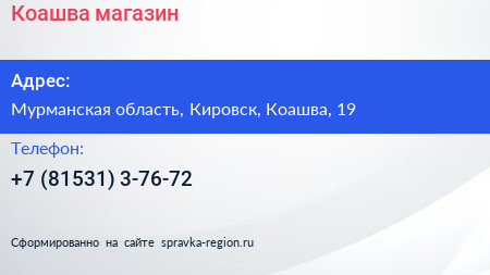 Коашва, магазин по адресу Мурманская область, Кировск, Коашва, 19 в дальнейшем Организация, размещена в следующих категориях: