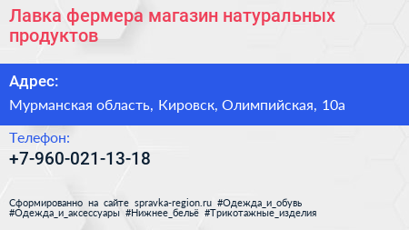Лавка фермера, магазин натуральных продуктов по адресу Мурманская область, Кировск, Олимпийская, 10а в дальнейшем Организация, размещена в следующих категориях: