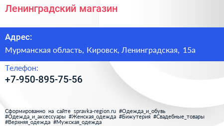 Ленинградский, магазин по адресу Мурманская область, Кировск, Ленинградская, 15а в дальнейшем Организация, размещена в следующих категориях: