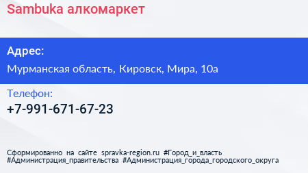 Sambuka, алкомаркет по адресу Мурманская область, Кировск, Мира, 10а в дальнейшем Организация, размещена в следующих категориях: