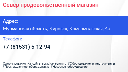 Север, продовольственный магазин по адресу Мурманская область, Кировск, Комсомольская, 4а в дальнейшем Организация, размещена в следующих категориях:
