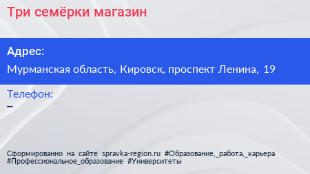 Три семёрки, магазин по адресу Мурманская область, Кировск, проспект Ленина, 19 в дальнейшем Организация, размещена в следующих категориях: