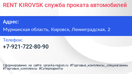 RENT KIROVSK, cлужба проката автомобилей по адресу Мурманская область, Кировск, Ленинградская, 2 в дальнейшем Организация, размещена в следующих категориях: